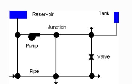 A typical pipe network system has the following feature entities 1) Reservoir (Source) 2) Pipe network 3) Pump system 4) Junction 5) Valve 6) Storage tank Fig:.3 These feature entities have their specific attribute information whichareverybasicforpipenetworkmodelling