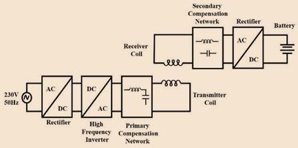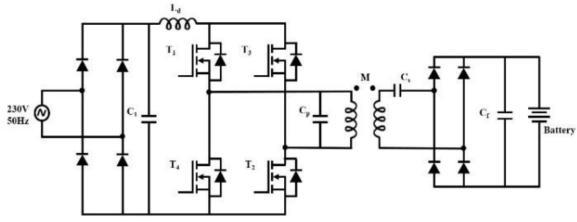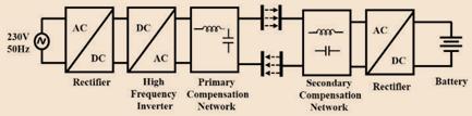 ForwirelesschargingsystemsofEVs,powerelectronicsplay animportantroleformaximumsystemefficiencyatpower conversion stage. This is very crucial for primary stage of wireless charging of EVs. Therefore, in power conversion stage,halfbridgeorfullbridgeispreferred.Becauseofthe alternating current in the magnetic coupling between the loops,inputvoltagesovertheessentialandtheoptionalside areexchanging.Twocontrolconvertersarerequired,onein theessentialsideandtheotheroneintheoptionalside.In the essential side, a twofold stage is commonly utilized, consistingofanAC-DCandaDC-AC(thisDC-ACistheone featuredinFig.3andFig.4).Theobjectiveofthistwofold stageistobuildthepowertransferfrom50Hz(or60Hz)of thenetworktokHzoftheIPT.IntheauxiliarysideanAC/DC stage is required. The recent research for the most part, centersaroundtheessentialDCsegmentandtheauxiliary DC segment. The increase in reactive current losses increasestheVAratingsoftheinputsourceasmoreactive power transfer to the load is required. To avoid this, compensation networks are used in parallel and series configuration.
