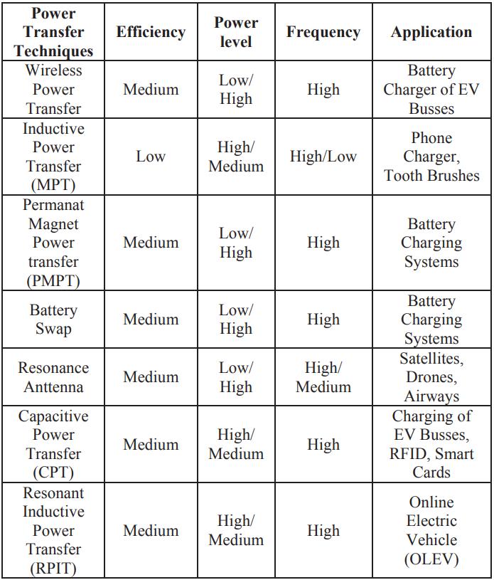 WirelessPowerTransferSystemImplementationofwireless charginginEVapplicationsprovidesremarkableoutcomes. Along with the aforementioned merits, it can reduce the batterystoragerequirementto20%throughopportunistic chargingtechniques[8-9].ForEVs,opportunisticchargingis possiblebyplacingthewirelesschargersindifferentparking areas,fore.g.,home,office,service,shoppingcomplexesand other general parking areas. Also, these chargers can be installedinthetrafficsignalareasforquickrecharging.For rechargingelectricbusesitcanbeinstalledinbusterminals, bus-stops and traffic signals. Three types of WPT TechnologiesInthissectionabriefoverviewandqualitative comparison of all the possible WPT technologies are reportedinTableI.Basedonthisstudy,themosteffective technologyisselectedformediumpower(fractionofkWto severalkW)andmidrangeairgap(about100mm-350mm) applications, which are especially suitable for EV battery charging.