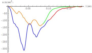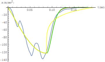 Forthelowerseveritycollisiontest,thefirsttwomodelsfor the separation phase, again, were virtually overlayed in regardstokinematicresponsesshowninFigure14-16. Both ofthesemodelsprovideabetterfittotheactualdatawhen compared to the fit provided by the third model. With respecttotheterminusoftheclosurephaseforthecollision test, the modeled responses lag the actual response secondarytotheformerfallingbetweenthetimestepsofthe latter. The impact of this is most apparent on the acceleration response as shown in Figure 14. The differencesbetweentheactualdataandthefirsttwomodels, in regards to the acceleration response, as expected, are minimizedforboththevelocityanddisplacementresponses (asperFigures15and16respectively).