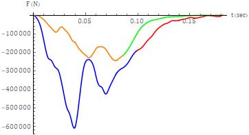 The data reduction for both collision tests, as expected, produced total barrier force time histories that were indicative, even under the modeling constraints of uniaxiality,ofamultipledegreeoffreedom(MDOF)system response. This is clearly evidenced by multiple, interval, substantive,extremaratherthanasingularextremum. The total barrier force time history for both tests is shown in Figure2. Forthelowerspeedtest(i.e.v03196),theclosure phaseparametersweredeterminedtobethefollowing:tc = 85.83msec, u1c = 1c =0.3732m, a1c =-122.1m/sec2 , Fc = 2.174 105 N and IWA = 3.958 104 J. The closure phase