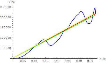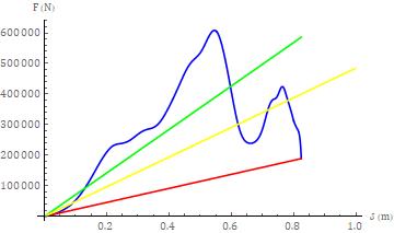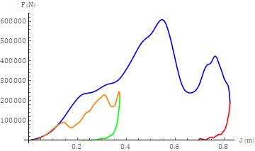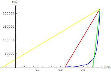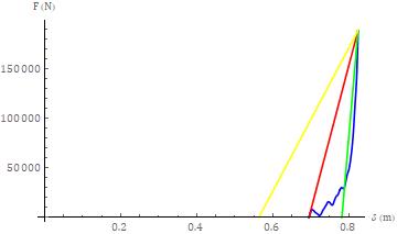 Separationphaseforce-deflectionresponsefor testv01990(blue)withthefirst,secondandthirdmodels, asperthetext,shownbythered,greenandyellowcurves, respectively.
