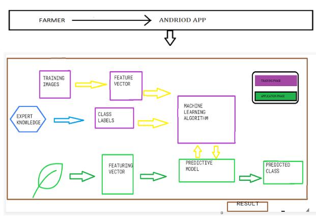 Farmer can capture the particular leaf acquired using an android camera after successfully installation of this app, thenmachinelearningtechniqueisappliedtotheacquired image to extract useful results that are necessary for the analysis.basicprocedureoftheproposedplantleafdisease experiments and evaluations on different segmentations, featureextractionsandclassificationmethodsweredoneto find the most effective approach and identification based detection algorithm is used in this model. Farmer can get result is which disease infected by the plant like fungus, viruses