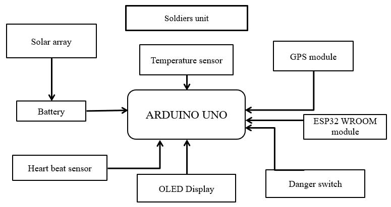 Theblockdiagramrepresentsthecomponentsusedinthe device. The battery is charged with the solar array that supplythepowerfortheworkingofthedevice.Theheart beatandtemperaturesensorsareusedtomonitortheheart beat and body temperature of the respective soldiers. IoT moduleisusedforthedata transferbetweensoldiersand thebaseunit.GPSmoduleisusedtoidentifythelocationof the respective soldier. Danger switch is used in case of emergency situations, if any abnormal situation happens around the war field then danger switch can be used manually for the soldier. Battery, heart beat sensor, temperature sensor, IoT module, GPS module and danger switchareconnectedtoArduinoUNOmicrocontroller.