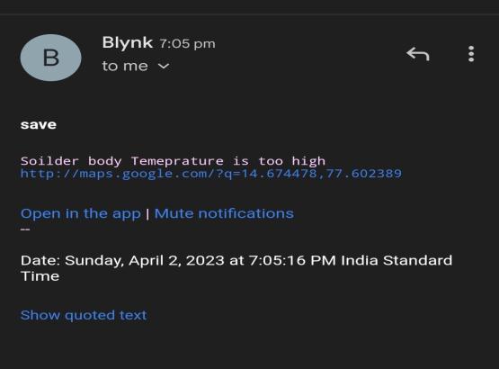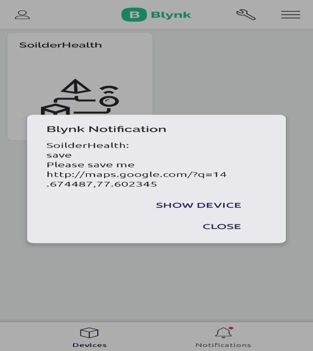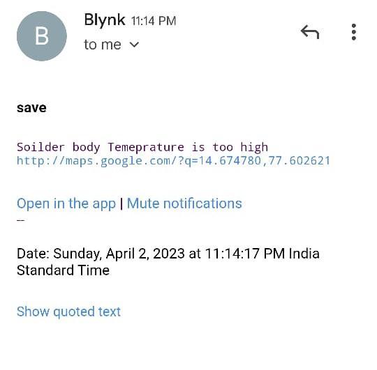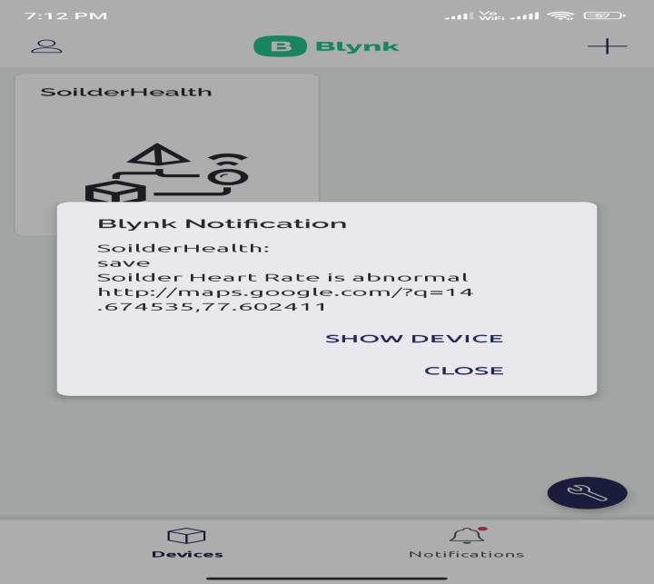 When the soldier carriesthedevice, thenGPS module, IoT module,heartbeatandtemperaturesensorsgetactivatedand monitorsthelocation,heartrateandbodytemperatureofthe respective soldier. If the heart rate increases or decreases thanthenormalheartrateofthehumanbeingorifthebody temperature increases or decreases than the normal body temperature of the human beings or if the heart rate and bodytemperatureisinnormalconditionbutthesoldierisin abnormalconditioni.e;ifthesoldierhasbeencapturedbythe enemiesorhedislocatedintheenemiesbasecampthenhe willpressthedangerswitchthentheindicationgoestothe basecampviaalarmoranyindicatorthentheofficialstake necessaryactiontosafeguardthem.