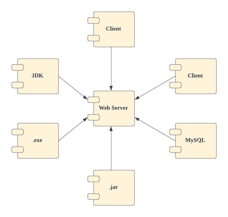 ComponentdiagramofoursystemisdisplayedinFigure6. In the diagram components communicate with each other using interfaces. The interfaces are linked using connectors.Inoursystem we have 6 components namely JDK, Client, MySQL,.jarand.exethatisconnectedwiththe main web server. Thesecomponents interact with each other when required and revert back to the main web server.