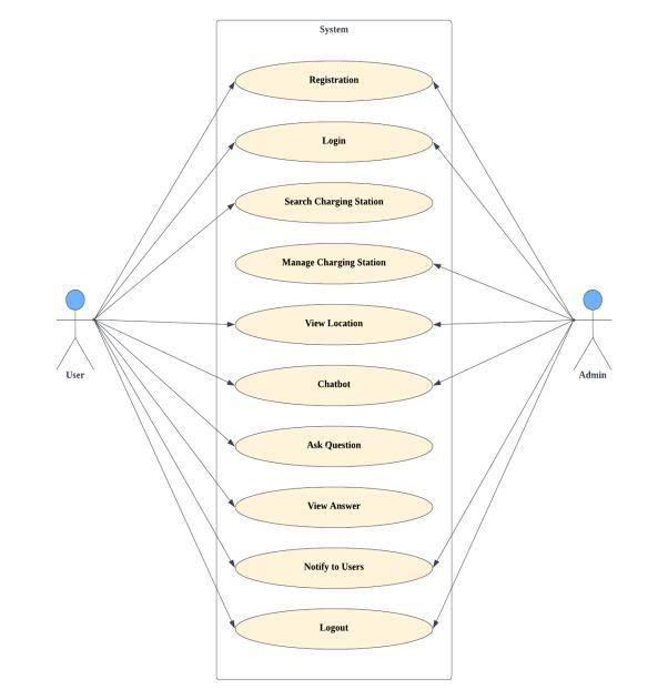 Use case dig of our system is depicted in Figure 5. The use case diagram of our system has two actor that is the user and the admin. The user is directly related to registration, log in, searching charging slot, asking question, using chatbot and receiving notifications and the admin handles theregistration,slot booking, etc. activities.