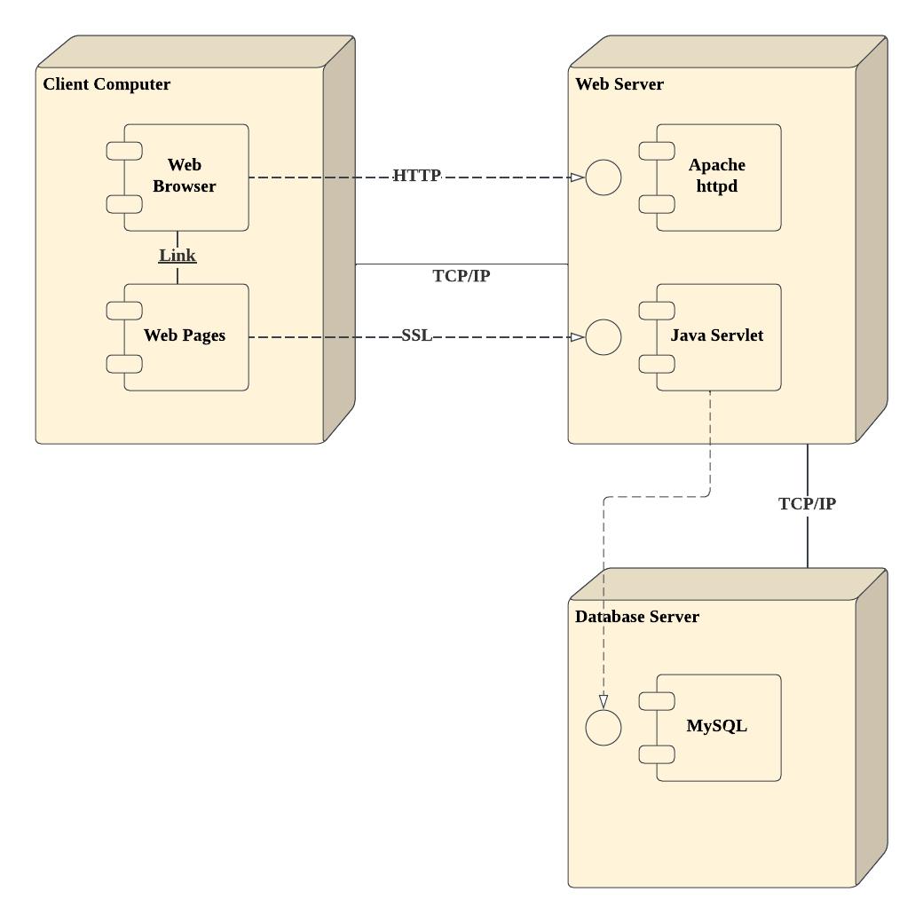 Figure 7 shows the deployment of the system. In this diagram, a node represents the client’s computer. A component represents the web browser that is linked to the web pages. There’s an interaction between the Clients computer and the web server. Web browsers and web pg depend on the web servers’ HTTP and SSL. And java servletdependsonMySQLas a database server. These 3 nodes i.e. a client computer,web server, and database serverareconnectedwithaTCP/IPconnection.