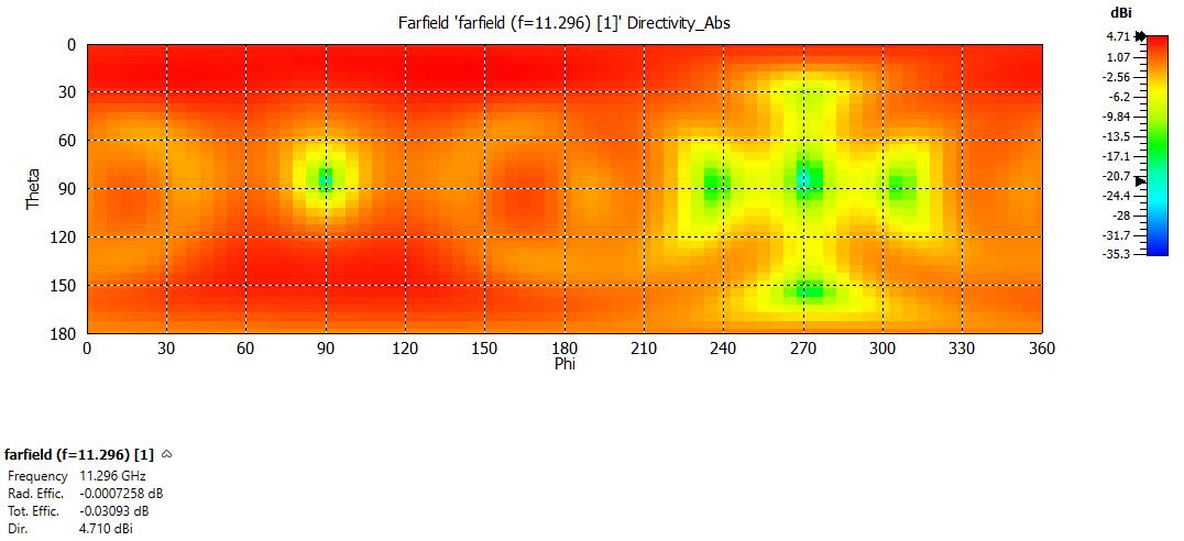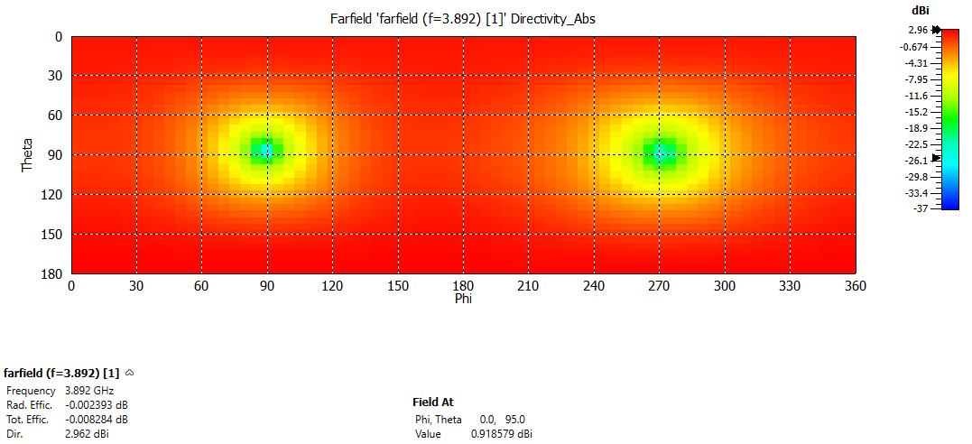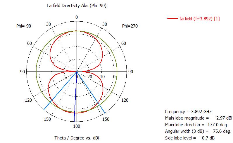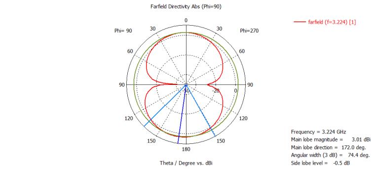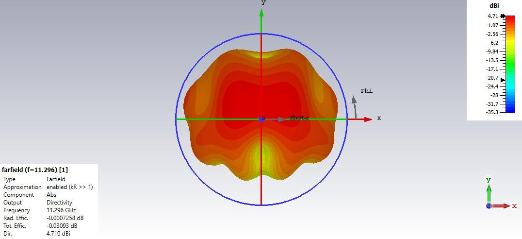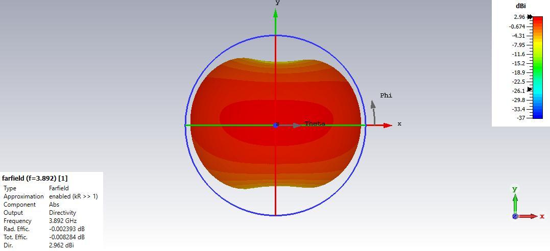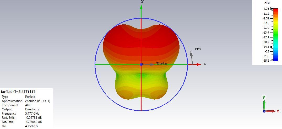 Figure4depictstheradiationpatternofthepolarplotforresonantfrequenciesof3.892GHz,5.477GHz,and11.296GHzforthe proposedtextilemicrostripantenna.Figure5depictsthetwo-dimensionalCartesianradiationpatternat3.892GHz,5.477GHz, and11.296GHz.Figures6and7depictthetwo-dimensionalandthree-dimensionalradiationpatternsatresonantfrequencies 3.892GHz,5.477GHz,and11.296GHzarethefrequencies.Theradiationpatternindicatesthemajorlobe'sorientation=177.0 degrees,150.0degrees,and11.0degrees.Anangularwidth(3dB)of75.6degrees,51.0degrees,and47.4degrees,withamajor lobemagnitudeof2.97dBiataresonantfrequencyof3.892GHz,4dBiataresonantfrequencyof5.477GHz,and4.27dBiata resonantfrequencyof11.296GHz.Witharadiationefficiencyofalmost0.002393dBfor3.892GHz,0.02781dBfor5.477GHz,and 0.0007258dBfor11.296GHz,directivityis2.962dBi,4.759dBi,and4.710dBi.