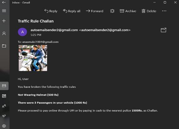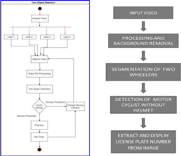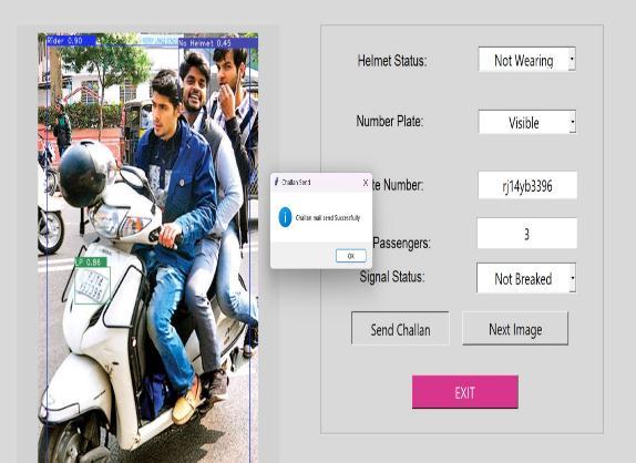 fed to the YOLO algorithm to determine whether motorcyclists are wearing helmets or not. The object detection is performed at three situations. originally, a motorcycle(s)withapersononit'sidentifiedandalsothe helmet is detected. However, also the license plate recognitionisdone,Ifthe model identifiesthattheperson isn't wearing a helmet. All these stages are enforced using YOLOv4.Oncetheobjectdetectionprocessiscomplete, an Optical Character Recognition (OCR) API is employed to extractthenumberplateofthevehicle.TheOCRisfedwith a cropped imageofthelicense plate tocarryoutthis task. The extracted numberplate iscomparedwith information of motorcyclists stored in a database using SQL queries and an dispatch conforming of violation details and a link topaythepenaltyistransferredtotheviolator