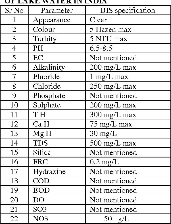 1. Water: Based on the test result optioned form the site visit samples all the required parameters are within the limit of the Indian standards: The Ph of the sample water is 7.72 which is within the pH range provided by Indian codes and standard. NaOH required for the neutralization