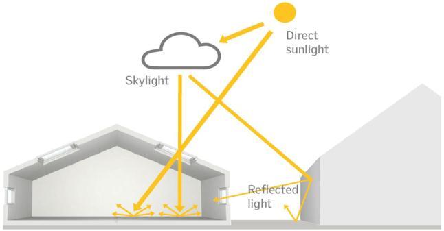 Daylighting is the practice of placing windows, skylights, other openings, and reflective surfaces so that sunlight (direct or indirect) can provide effective internal lighting. Particularattentionisgiventodaylightingwhiledesigning a building when the aim is to maximize visual comfort or toreduceenergyuse.Energysavingscanbeachievedfrom the reduced use of artificial (electric) lighting or from passive solar heating. Artificial lighting energy use can be reduced by simply installing fewer electric lights where daylightispresentorbyautomaticallydimming/switching offelectriclightsinresponsetothepresenceofdaylight –aprocessknownasdaylightharvesting.
