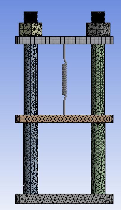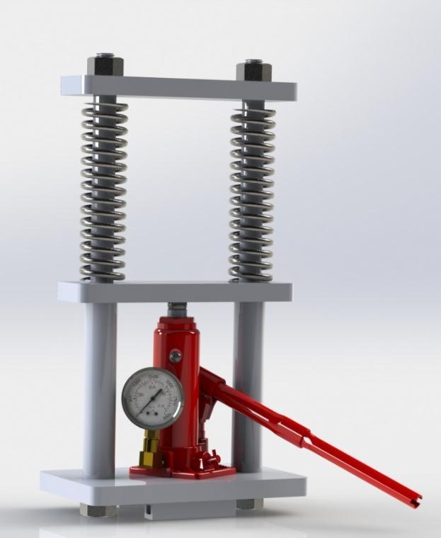 A compression spring is placed between the two plates, acting as a load cell. The plates are supported by two vertical barswithaheightof500mmeach.Thehydraulic jack is mounted on the base plate and is used to apply forcetothesystem.