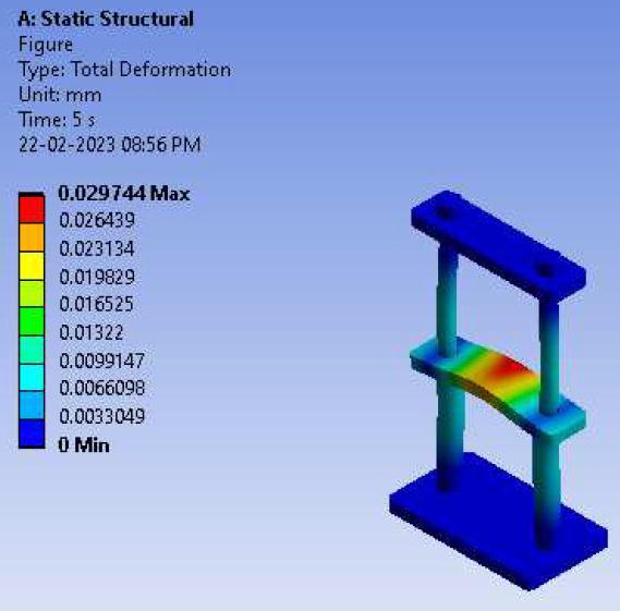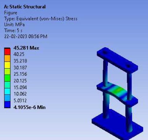 The FEA analysis showed that the maximum stress in the system was well within the yield strength of the material, andthedeflectionofthesystemwasnegligible.Theresults indicated that the frame structure was structurally sound and stable under the maximum load capacity of the hydraulicjack.[3]