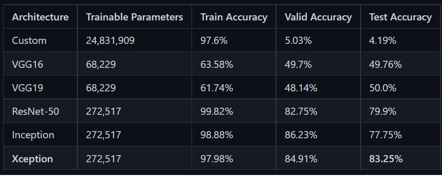 An inception network is a deep neural network with an architectural design made up of re- peating components knownasInceptionmodules.ForourtestCGG16achieved anaccuracyof77.75%.