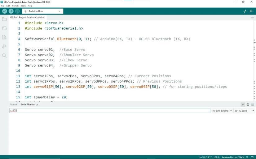Arm jitters due to a continuous stream of data from android app to the serial of HC-05 Bluetooth Module as shown in Fig.8. Continuous stream of data fed to the Arduino microcontroller makes it an invalid data string whichisthemainreasonbehindthejitters.