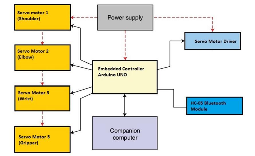 The Robotic Arm can be controlled wirelessly using the Bluetooth Technology, it is interfaced to the microcontroller using a Bluetooth module known as HC05. An app is developed for the android platform, which communicates serially from the android smartphone to the HC-05 module, which then is processed and executed usingmicrocontrollerandthecorrespondingservos.Basic layoutoftheroboticarmisinspiredbyreference [1].