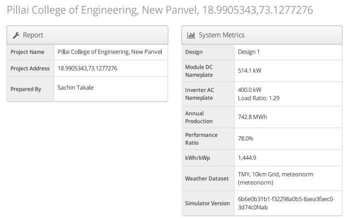 ThetotalrequireddesignsolarPVcapacityis514kWpDC. The cumulative maximum AC output from string inverter is 400 kW. The yearly solar generation of 742.8 MWh is