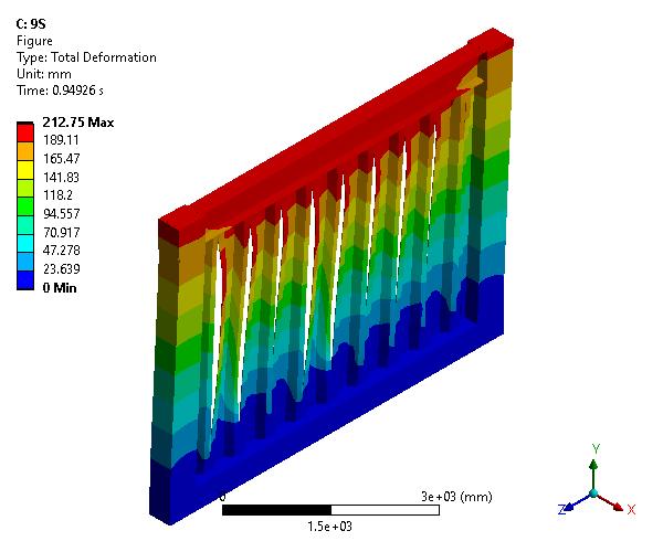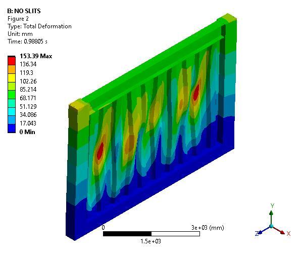 Theabovefiguresshowsthetotaldeformationdiagramsofwallwithoutslitandwallwithninenumbersofslits.Themodelwithoutslit have the maximum deformation atthe center partof walland the modelwith nine numbersof slithave maximum deformation at the top endofslitofbeamthenitreducesuptobottom.in thisobjectivepart10modelsareanalyzed(modelwith1-9numbersofslitand modelwithoutslit).Andalsodifferentmodelsof3to7numbersslitmodelswereanalyzed.
