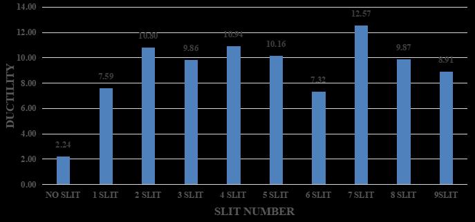 The load-deflection curves can be used to design and optimize structures such as beam columns and bridges. Engineers canusethecurvetodeterminemaximumloadastructurecanwithstandbeforeitfails,andadjustthedesignaccordingly. The graph given above shows the load vs displacement graph .after that different models of same number of slits are analyzed.Theductilitybarchartsofallmodelsaregivenbelow.