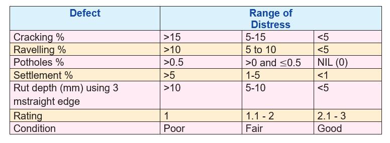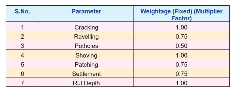 TheFinalRatingValueiscalculatedbytakingtheaverageof theWeightedRatingValues ofallparametersviz.cracking, ravelling, potholes, shoving, patching, settlement and rut depth.Similarly,finalratingforothercategoryofroadsmay alsobeworkedout,usingthesameapproach.