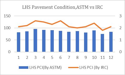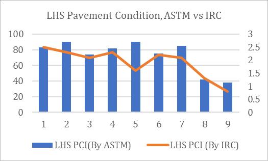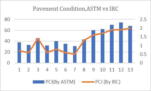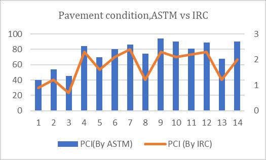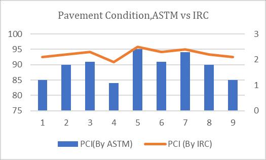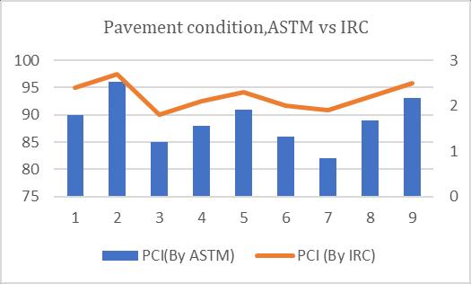 InASTMmethodweconsiderthedistressseverity,itsdeduct value,totaldeductvalueandcorrecteddeductvalue,butin theIRCMethodweonlyconsiderthedensityofthedistress onpavementitsRatingisgivenasperIRC82:2015,thenavg oftheweightedratingvaluegivesthePCIoftheroad.