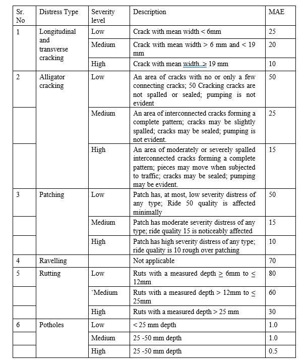 Thecircumstantialdescriptionofvarioustypesofdistresses considered with their level of severity is given in Table No.1The distress index is evaluated using the principle of Maximum Allowable Extents (MAE). The maximum allowableextent(MAE)forlow,mediumandhighseverity levelforeachtypeofdistresswhichisusedtoevaluatethe PCIhasalsobeengiveninTable.