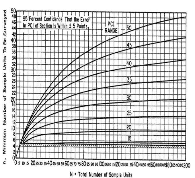Tofindthenumberofsamplestobesurveyed,startontheN scale,proceedverticallytothesuitablecurve(PCIrange= 25)andreadthevalueonthenscale.Thiswillgivenumber ofsampleunitsshouldbesurveyed.Thespacingintervaliof theunitstobechosenistakenfromthefollowingequation: