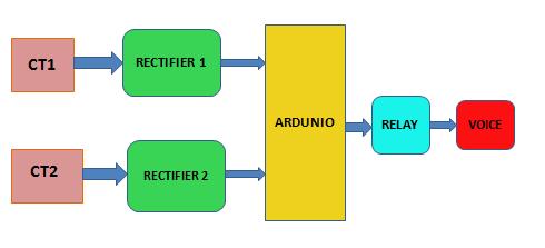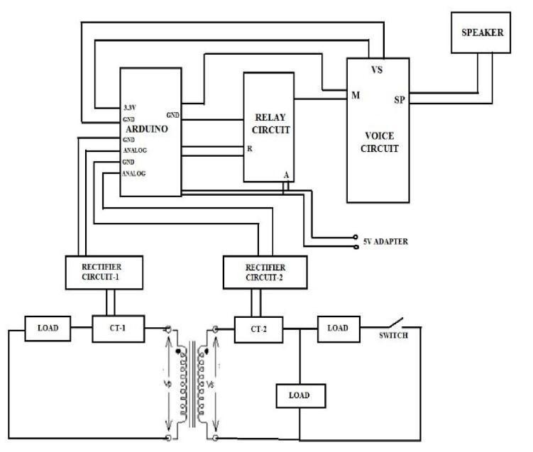 As seen in the circuit diagram figure 2 there are many componentsconnectedtoperformproperly.Theinputis fedtotheprimaryoftheisolationtransformerusedhere instead of the power transformer. Two current transformers are used to sense the input current. Input is given to the transformer through the current transformer placed at the input terminal (CT-1).CT-1 senses the magnitude A.C fed to the primary isolation transformer and the current is then supplied to the rectifier to convert it into corresponding D.C and then D.CissenttotheArduinoboard.Aftertheinputisfedto the transformer, the isolation transformer induces the samevoltageinthesecondaryofthetransformerthenit passesthroughthecurrenttransformerconnectedtothe secondary side of the transformer (CT-2). CT-2 senses thecurrentinthesecondaryoftheisolationtransformer andpassesittorectifiercircuit2whichconvertsittothe correspondingD.ClevelwhichisfedtoArduino.Arduino aftergettingtwoinputsignals fromtworectifiercircuits for comparison. Arduino compares the two signals to find any difference between the input signals and if the difference is greater than pre-set value then Arduino sends a signal to the relay to shut the circuit. Arduino andvoicecircuit workson 5-20vD.C supply. Toget the D.C supply of 5-20 v a stepdown transformer is used in the circuit (220/12). The output of the stepdown transformer isthen fed to therectifiercircuit to convert itto12VD.Cwhichisgiven toArduinoand voice circuit fortheirworking.Theloads areconnectedacross 230 V A.Csupplydirectly on the secondaryof thetransformer.