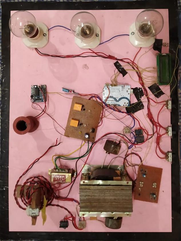 Eachloadisprovidedwith a separateswitchtooperate. AVoice circuit isprovided togiveanalertat thecertain differences in the primary and secondary current through a speaker. Relays control the loads and voice circuit. Arduino is the main component in this circuit. It is a single-board microcontroller programmed by using Arduino programming language (java). Arduino is used to comparing the currents on both primary and secondary. Two rectifier circuits are used in this circuit to convert the AC voltage into DC voltage for the use of Arduino. Current transformers also provided one on primaryandanotheronsecondarytotapthecurrentson both sides and to give proportionate voltage to the rectifier circuit. The output of the Arduino is connected to the relay. The relay here is a 12V DC 1-phase relay. Under normal operating conditions currents on primary and secondary are the same. So, the proportionate voltages generated by the current transformers on primaryandsecondaryarethesame.Thesetwovoltages are given to the Arduino. The proportionate voltages generated by current transformers are rectified by the rectifiers in the circuit. These two voltages will be the same in magnitude and the difference is zero. So, the Arduinogivesnosignaltotherelay.Wheneverextraload or an internal fault occurs in the transformer the currents sensed by the CT on primary and secondary differs by some amount. As a result, the voltage sensed by the Arduino from primary and secondary differs. As thereisadifferenceinthevoltagesensedbytheArduino i.e., the difference is not zero. Arduino, give a signal to therelayaccordingtoapredefinedprogram.Therelayis activated by the Arduino microcontroller the relay then activates the voice announcement circuit. The voice circuitwillgivetheoutputapredefined voiceasanalert to the operator. After three consecutive voice alerts Arduino will give a trip signal to the relay board. The Relay board is connected in series with the supply will open its contacts thus the supply to the hardware setup willbedisconnected.