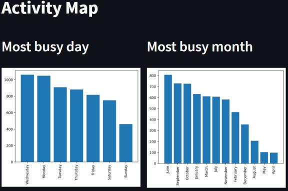 Anactivitymapprovidesinsightintothebusiestmonthand dayformessagingactivity,displayedinbarchartformat.