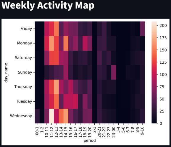 A weekly activity map shows hourly usage trends across differentdaysusingaheatmap.
