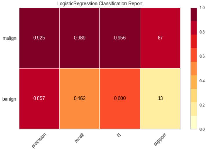 According to the above classification report, logistic regression is giving promising results (and precisely identifying 92.5 percent malign and 85.5 percent benign files).