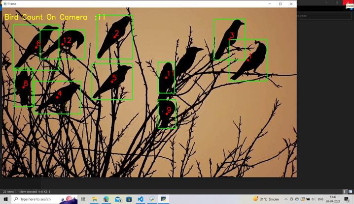 Choosethevideoforanalysisanddetectionofbirds.Play the video, and then you can see how many birds and varieties of bird are in your field or video. Two different category of birds are recognised simultaneously. The UI created for detections of birds and species works in the background and gives output on screen. It provides the count and start the buzzer when we have reached the count.