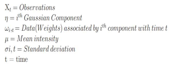 We prefer the MOG2 method because of its soft memory consumption and soft complexity rate. For the MOG2 the backgroundisconsideredasaparametricframeandeach pixel is represented as the particular number for Gaussian function. The equation is given as :