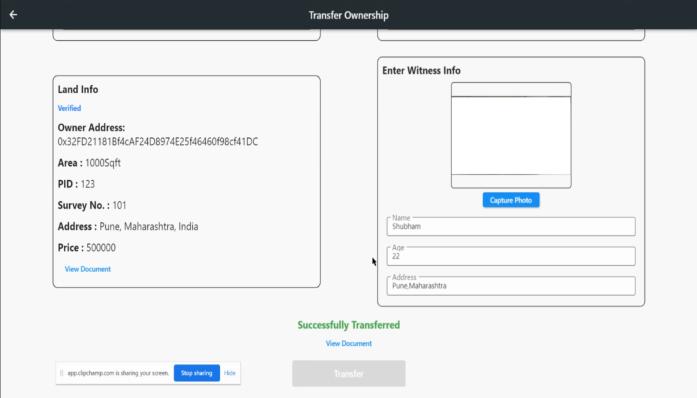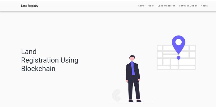 Login Page – Onthefrontscreen,onecanloginasauser, landinspector,orcontractowner.Thecontractownercan addalandinspectorandseealltheaddedlandinspectors. Thelandinspector’sdashboardconsistsofthefunctionality toverifyuser,verifylandandtransferownership.Ifwelogin astheuser,wehavetheoptionsofaddinglands,landdetails, seeingalllands,sendingandreceivinglandrequests.