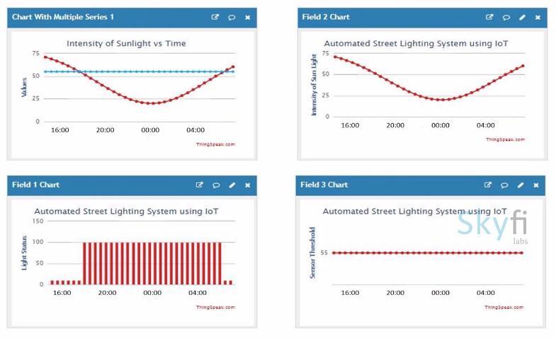 To gather data from the sensors and provide visualizations based on the incoming light intensity, the thresholdthathasbeenset,andthestartinglightintensity withregardtotime, wewill beusinganopencloudserver called Thing Speak API in this project. We can more effectively monitor and maintain the street lights with the helpofthisdataandvisualizations