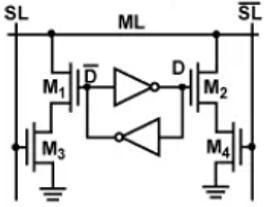 ACAMcellhastwobasicfunctionalities:storingabitin SRAMandcomparisonofabit.NOR-typeCAMcellisshown inFig5.Thecomparisonbetween andDwhicharestored inmemory,andthesearchdataissentonthesearchline andSL.ByusingdynamicXNORlogiccomparisoncircuitthe outputisdrawnfrommatchlineML.ThemismatchofDand SL activates the pulldown path, connects ML to ground.