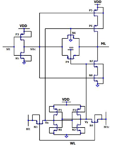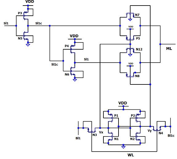 Fig 6. shows SRAM based TCAM with XNOR transistor logic circuit as a compare circuit, where data is stored in nodeVxatSRAM1andVyatSRAM2.