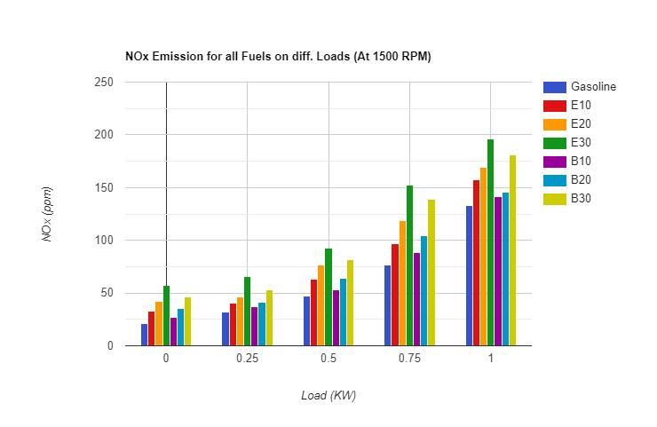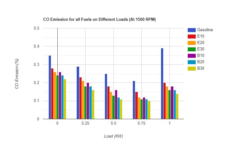 TheCOEmissionforfuelblendsislowerthanpuregasoline.ThereasonoflowerCOemissionforalcoholfuelblendsisthe presenceofoxygenmoleculesinthealcohol whichaidstothebettercombustionof fuel whereasnooxygenispresentin gasoline. Asthealcoholpercentageincreasesinthefuel,COemissiondecreasesuptoacertainvalueofloadduetooxygen richburningandthenincreasesbecauseincreasingloadrequiresmorepowerrapidlybutasalcoholshavecomparatively lowercalorificvalueandhighervapourpressurethangasolinetherefore,gasolinemoleculesburnsfasterinorderto fulfil the energy demandanda slightdelayisobservedinburningof alcohol moleculesascomparedto gasoline whichresults heterogeneousburningoffuelblendandresultincreaseinCOemission.COforbutanolblendsisfoundlowerascompared to Ethanol blends. The reason behind the lesser CO emission of butanol is the lower heat of vaporization and higher calorific value as compared to ethanol due to that butanol blends burns with high temperature as compared to ethanol blends Hence better combustion results decrease in unburnt hydrocarbon particles. Hydrocarbon Emission is found minimumforB30.Itisbecauseofthehigherpercentageofbutanolwhichresultsbettercombustionthanthatofotherfuel blends.
