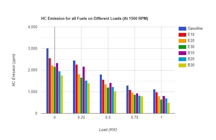 TheHCEmissionforfuelblendsislowerthanpuregasoline.ThereasonoflowerHCemissionforalcoholfuelblendsisthe presenceofoxygenmoleculesinthealcohol whichaidstothebettercombustionof fuel whereas nooxygenispresentin gasoline.Asthealcoholpercentageincreasesinthefuel,unburnthydrocarbonemissiondecreasesbecausetheamountof oxygen is also increases with alcohol which leans the air fuel mixture and results for better combustion of fuel. HydrocarbonEmissionforButanolblendsisfoundlowerascomparedtoEthanolblends.ThereasonbehindthelesserHC emissionofbutanolisthelowerheatofvaporizationandhighercalorificvalueascomparedtoethanolduetothatbutanol blends burns more efficiently as compared to ethanol blends Hence better combustion results decrease in unburnt hydrocarbonparticles.HydrocarbonEmissionisfoundminimumforB30.Itisbecauseofthehigherpercentageofbutanol whichresultsbettercombustionthanthatofotherfuelblends