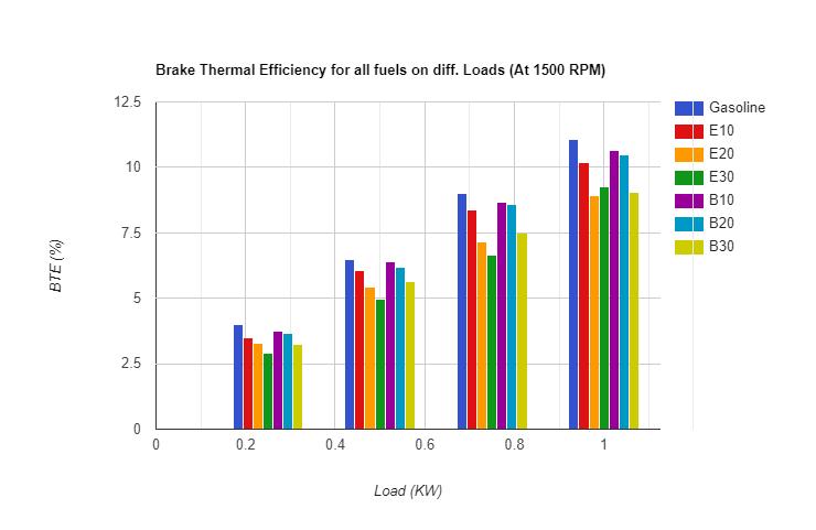 The same procedure is repeated for 0.50 KW, 0.75 KW and 1 KW load and the readings of exhaust gas analyzer and stopwatchisnotedforrespectiveloads.Thetestingprocedureforblendedfuelsamplesisrepeatedinthesamemanneras followedforthetestingofgasolinefuelsampleandthereadingforeachfuelsampleisnotedcarefullyalongwiththefuel consumption timefor 10ml fuel at no loadand increasingloadas0.25 KW, 0.50 KW,0.75 KWand 1.0 KWrespectively. The value of Brake Thermal Efficiencies (BTE) and BSFC for each fuel is calculated using mathematical relations after calculating the properties of blended fuel samples whereas, the values of pollutant emission obtained directly from the readingsofexhaustgasanalyser.