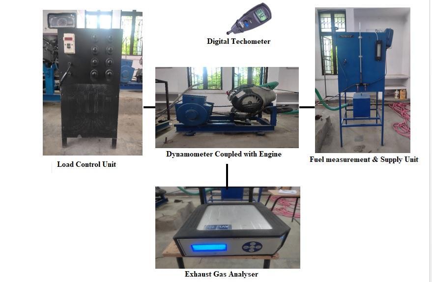 As shown in the figure the fuel supply is connected to the carburettor of two stroke petrol engine with control valve by virtueofwhichthecontrolledvolumeoffuelissuppliedtotheengine.Theengineshaftsubjectedtoachaindrivewhichis connected to the Eddy current dynamometer. The applied load can be adjusted by a control unit connected with the dynamometer.Theexhaustgasanalyserwithasufficientlylongerprobeassemblyisusedtoexaminetheexhaustfromthe engine.Theactualarrangementofexperimentalisrepresentedinthefollowingfigure.
