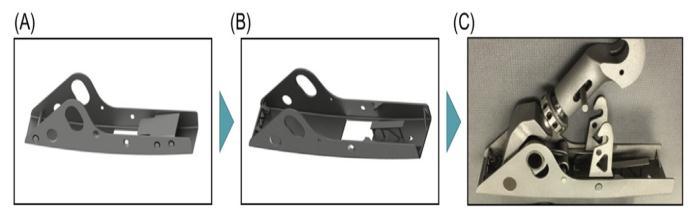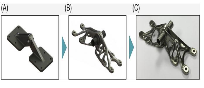 Inthisresearchpaper,wepresentanexampleoftopology optimization applied to an aircraft hinge product. The hinge's topology was altered to align with the current structural performance standards and optimised to minimiseitsoverallweight.Theresultingdesignwasthen manufacturedusinganAMlaserpowderbedtechnique,as illustrated in the accompanying photos. By changing the part's topology, the hinge's weight was significantly reduced, while ensuring it met the specified operational constraints.
