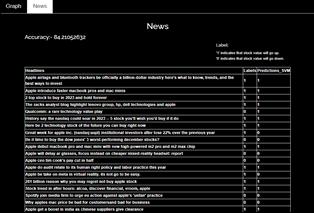 The module 1 of the system results a graph of the company stock created on the basis of prediction value from the RNN-LSTM model. The module 2 of the system which performs sentiment analysis results into the sentiment prediction of news headlines using the SVM machine learning algorithm to predict sentiment as negative or positive for a particular headline and the accuracyforapplestock.
