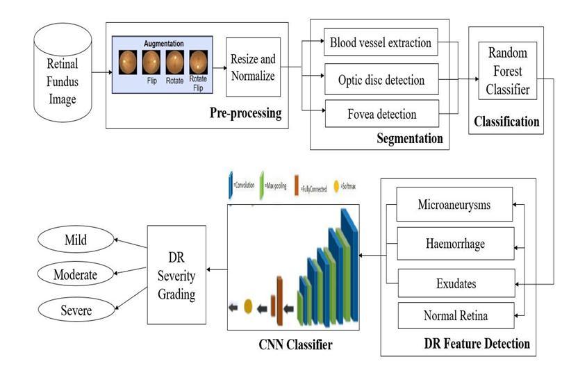 Figure3.1describestheoverallsystemarchitectureofthe proposed DR detection with its severity from Retinal fundusimages.Thissystemstartswiththepre-processing stage where augmentation, resizing and normalization of retinal images is done. Several segmentations, including blood vessels, the optic disc, and the fovea, are found in thepre-processedimages.Usingarandomforestclassifier, the DR features are found in these segmented images. Finally for each DR feature detected the severity of the disease is calculated using the CNN classifier for better accuracy.