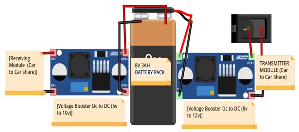 Here we used two Buck Boost Converter Module (DC to DC) which amplify the dc signal which we further used the charged the battery of the car and share the power to the receiver’s car. The receiver side booster converter boosted 5v receiveddcvoltageupto10vbecauseourbatterypackis8vandtochargethisweneed10vdcandwhiletransferringthis powertoanothervehicleagainweamplifythe8vto12vtoachievegoodrangeoftransmission.