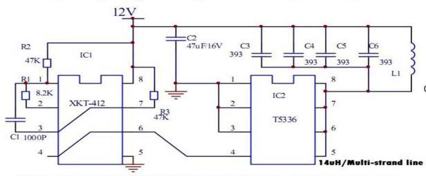 IntransmittercircuitweareusingtheICcircuit412whichispowerbysupplymoduleinreferencewitht5336inthe belowfigure2.1.Wegroundtheterminal5ofIC412and1,2,3withrespecttocapacitorof47Microfaradandproviding12 VoltinputtothecircuittoIC412withthehelpof47kresistortopinno.1andpinno.8similarlythis12valsogiventopinno.7 byaddingresistanceof47kpinno.7andpinno.3orpinno.3andpinno.1ofIC412areshortcircuitedinbetweenpinno.1 and3weplaceonecapacitorof1000ufpinno.2isconnectwith8.2kandresistortopinno.1nowpinno.4andpinno.6are alsoshortandthisoutputsendittoIC5336atpinno.4.12vinputisalsofedtoIC5336withthehelpof4capacitorof393ufto pinno.8,7,6,5becauseithasshortednow,weplacethetransmittercoilL1inparalleltothosefourcapacitors.