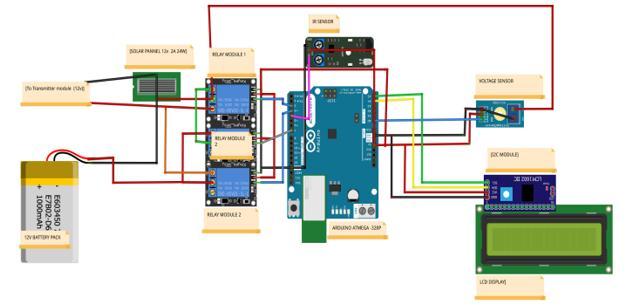 Wegive5vdctoallthesensorsandrelaymoduleandgroundalltheterminalswithARDUINOgroundpinandtodrive.The Arduinoweusedisof5vdcAdapter.S(signal)pinofvoltagesensorconnecttoA0pinofArduinoandweconnectIRsensorto D4pingofArduino.Nowthes(signal)pinofrelay1connectedtod2,relay2tod3andrelayd3tod7.AssembleI2Cmoduleonto thetopofLCDdisplayw.r.t1to16pins.Thereare4pinsofconnectSupplypinwith5vandgroundtogroundSCltoA5andSDA toA4ofArduino.