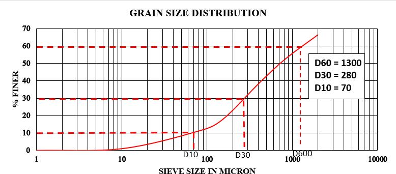 The value of coefficient of curvature, Cc obtained for Black Cotton Soil is 18.57 and that of coefficient of uniformity,Cu isobtainedas0.86.Forthegradedsoil thestandardvalueofCc liesbetween1and3andfor fine soil the Cu value should be greater than 6. Since bothofthesecriteriaarenotmet,thesoilisclassified aspoorlygraded.